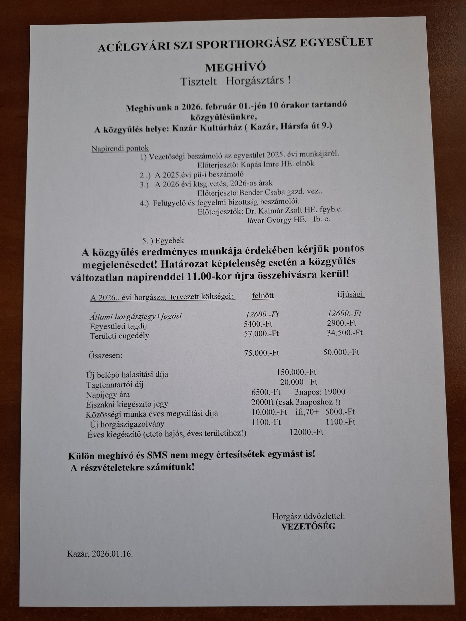 Horgász üdvözlettel: Tisztelt Horgásztárs! MEGHÍVÓ Meghívunk a 2020 február 2-án 9 órakor tartandó közgyűlésünkre, A közgyűlés eredményes munkája érdekében kérjük pontos megjelenését! Külön meghívó és SMS nem megy értesítsétek egymást is! Kazár, 2019. december